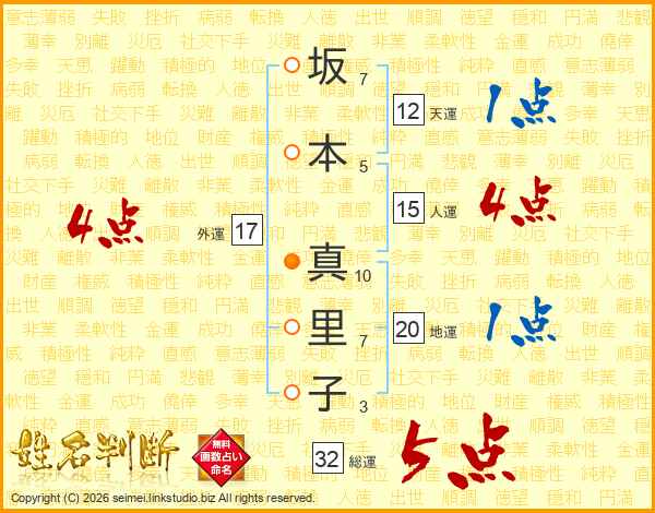 坂(7画)本(5画) 真(10画)里(7画)子(3画)