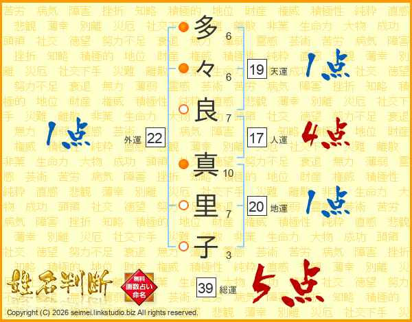 多(6画)々(6画)良(7画) 真(10画)里(7画)子(3画)