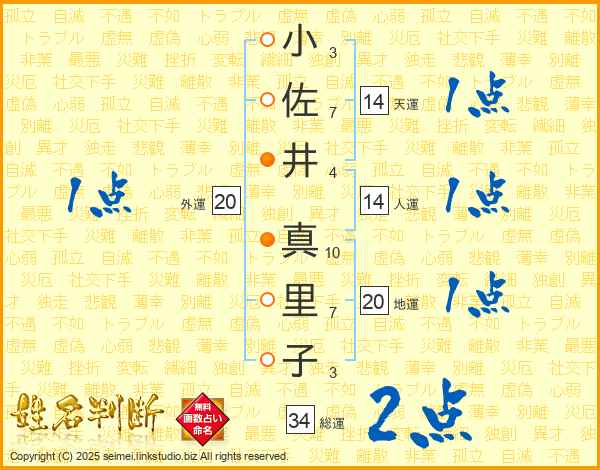 小(3画)佐(7画)井(4画) 真(10画)里(7画)子(3画)