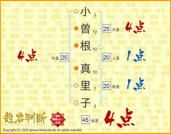 小(3画)曽(12画)根(10画) 真(10画)里(7画)子(3画)