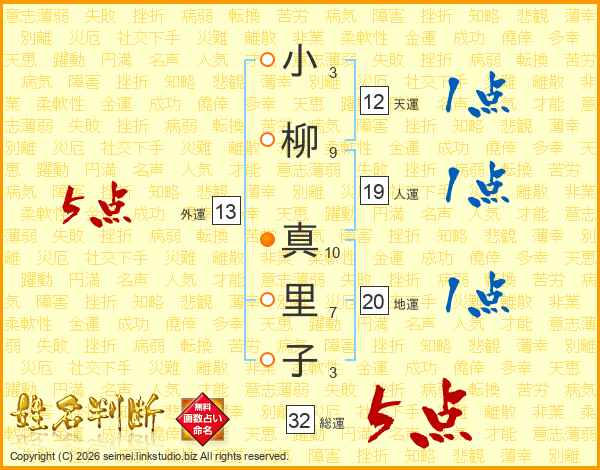 小(3画)柳(9画) 真(10画)里(7画)子(3画)