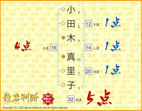 小(3画)田(5画)木(4画) 真(10画)里(7画)子(3画)