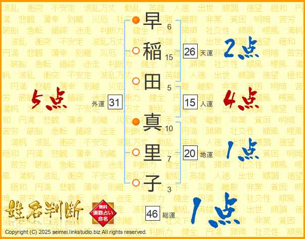 早(6画)稲(15画)田(5画) 真(10画)里(7画)子(3画)