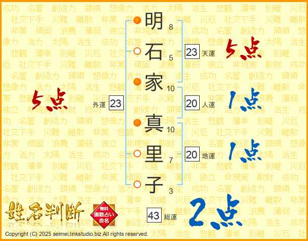 明(8画)石(5画)家(10画) 真(10画)里(7画)子(3画)