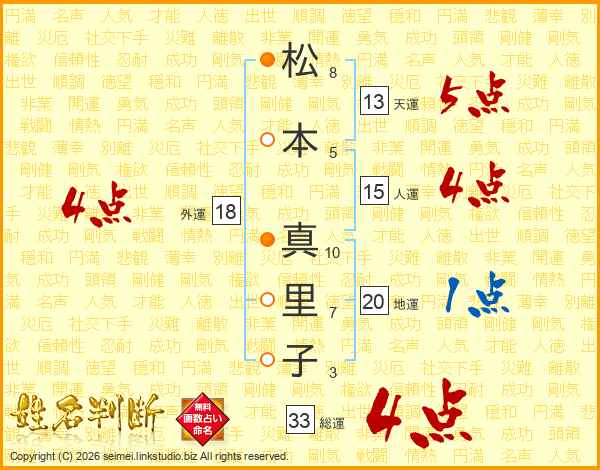 松本真里子さんの総運は33画の4点!