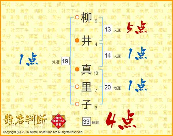 柳井真里子さんの総運は33画の4点!