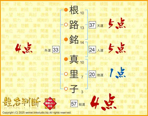 根(10画)路(13画)銘(14画) 真(10画)里(7画)子(3画)