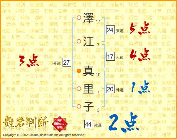 澤(17画)江(7画) 真(10画)里(7画)子(3画)