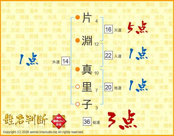 片(4画)淵(12画) 真(10画)里(7画)子(3画)