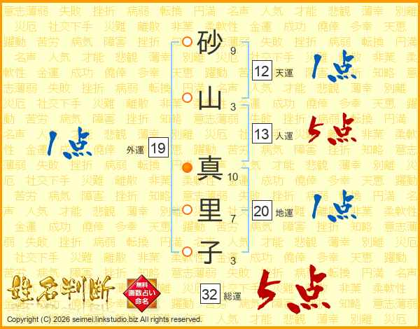 砂(9画)山(3画) 真(10画)里(7画)子(3画)