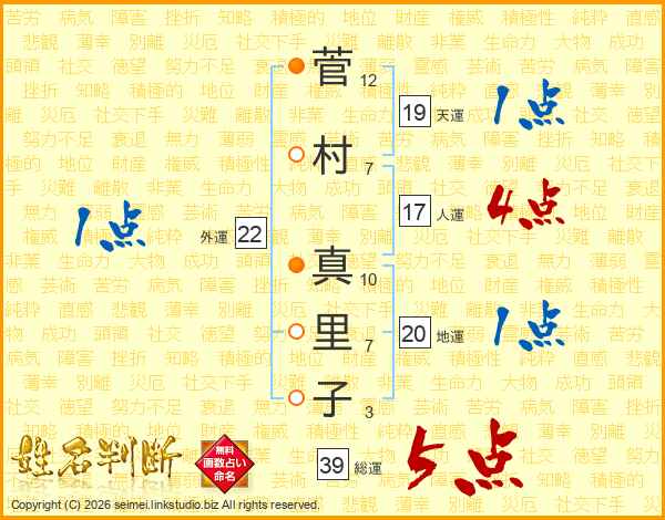 菅村真里子さんの総運は39画の5点!