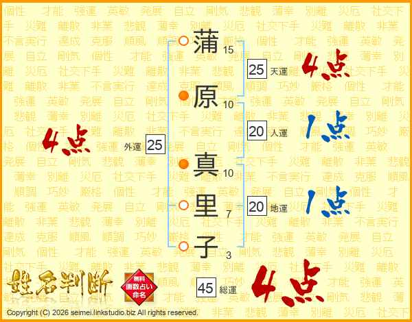蒲(15画)原(10画) 真(10画)里(7画)子(3画)