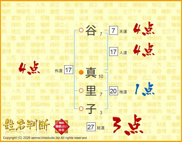 谷(7画) 真(10画)里(7画)子(3画)
