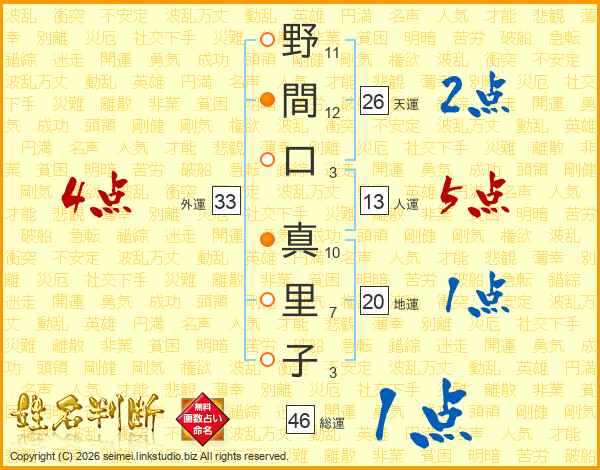 野(11画)間(12画)口(3画) 真(10画)里(7画)子(3画)