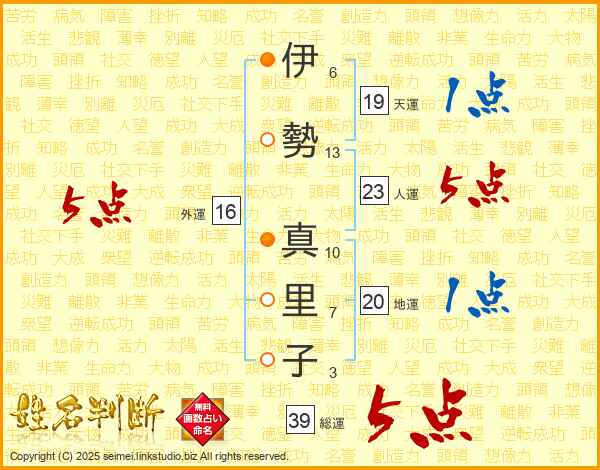 伊(6画)勢(13画) 真(10画)里(7画)子(3画)