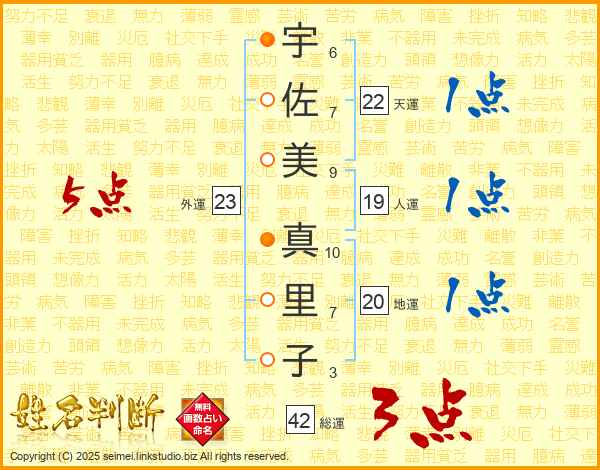 宇(6画)佐(7画)美(9画) 真(10画)里(7画)子(3画)