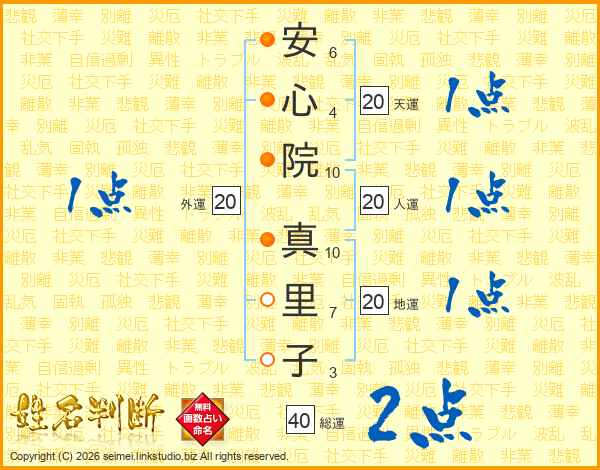 安(6画)心(4画)院(10画) 真(10画)里(7画)子(3画)