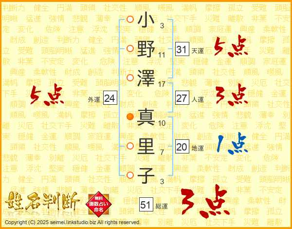 小(3画)野(11画)澤(17画) 真(10画)里(7画)子(3画)