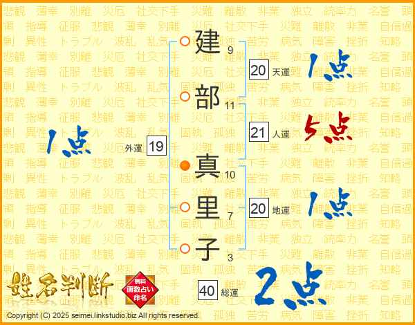 建(9画)部(11画) 真(10画)里(7画)子(3画)