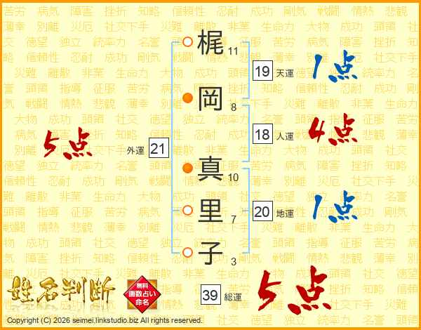 梶(11画)岡(8画) 真(10画)里(7画)子(3画)