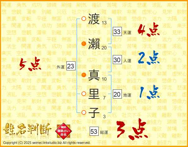 渡(13画)瀨(20画) 真(10画)里(7画)子(3画)