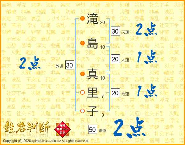 滝(20画)島(10画) 真(10画)里(7画)子(3画)