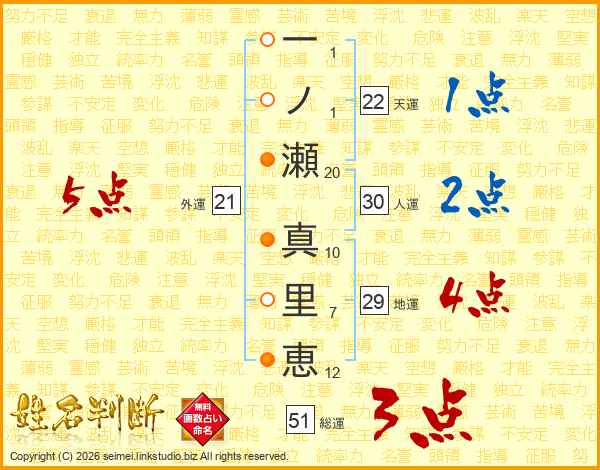 一(1画)ノ(1画)瀬(20画) 真(10画)里(7画)恵(12画)