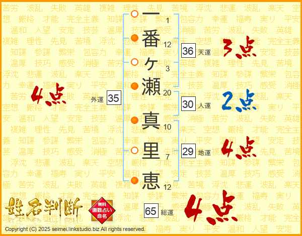 一番ヶ瀬真里恵さんの総運は65画の4点!