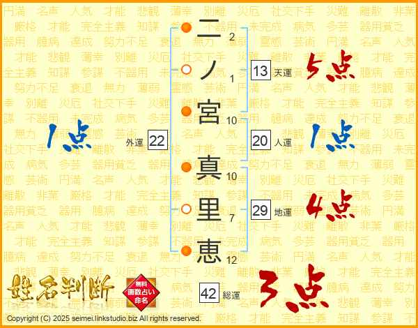 二(2画)ノ(1画)宮(10画) 真(10画)里(7画)恵(12画)