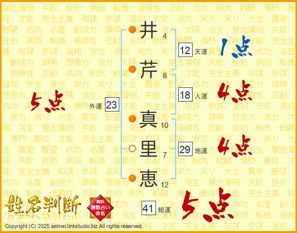 井(4画)芹(8画) 真(10画)里(7画)恵(12画)