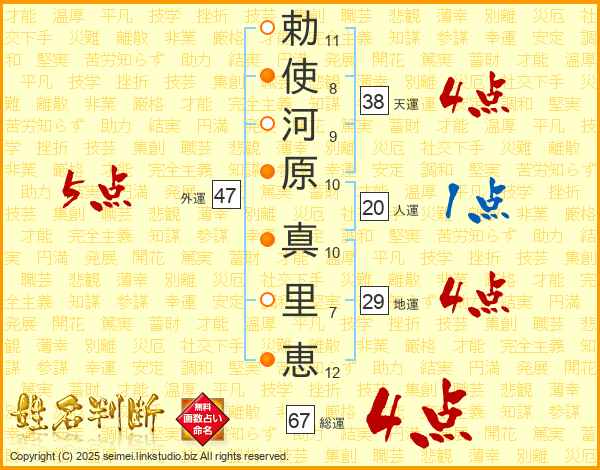 勅(11画)使(8画)河(9画)原(10画) 真(10画)里(7画)恵(12画)