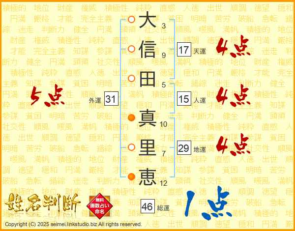 大(3画)信(9画)田(5画) 真(10画)里(7画)恵(12画)
