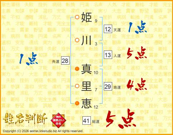 姫(9画)川(3画) 真(10画)里(7画)恵(12画)