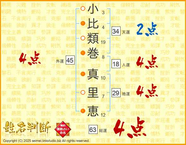 小(3画)比(4画)類(19画)巻(8画) 真(10画)里(7画)恵(12画)