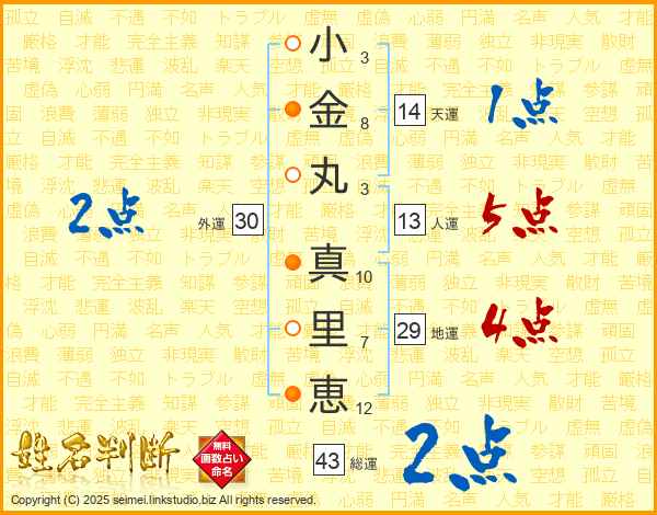 小(3画)金(8画)丸(3画) 真(10画)里(7画)恵(12画)
