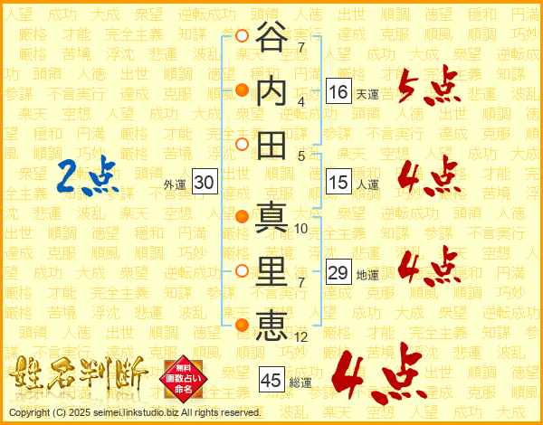 谷(7画)内(4画)田(5画) 真(10画)里(7画)恵(12画)