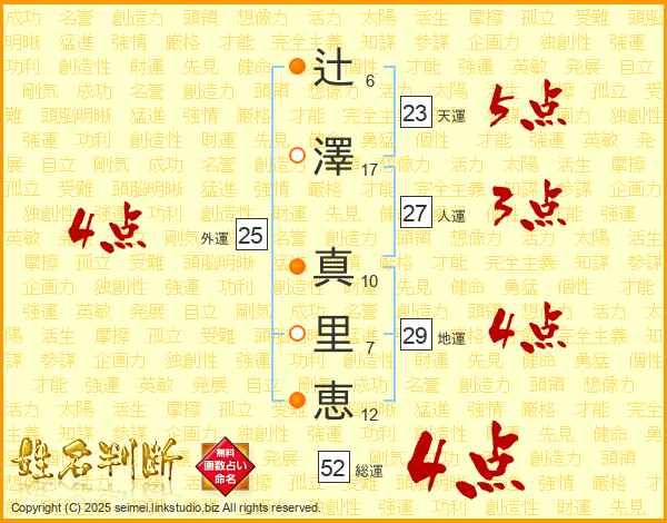 辻(6画)澤(17画) 真(10画)里(7画)恵(12画)