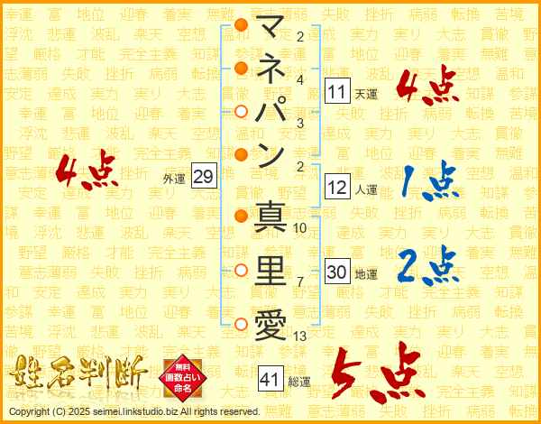 マ(2画)ネ(4画)パ(3画)ン(2画) 真(10画)里(7画)愛(13画)