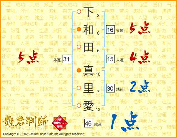 下(3画)和(8画)田(5画) 真(10画)里(7画)愛(13画)