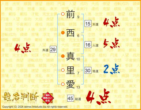 前(9画)西(6画) 真(10画)里(7画)愛(13画)