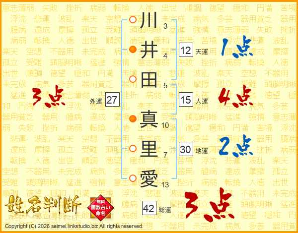 川(3画)井(4画)田(5画) 真(10画)里(7画)愛(13画)