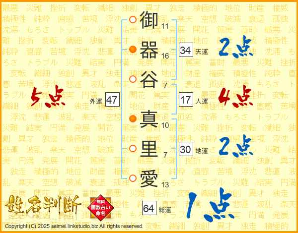 御(11画)器(16画)谷(7画) 真(10画)里(7画)愛(13画)