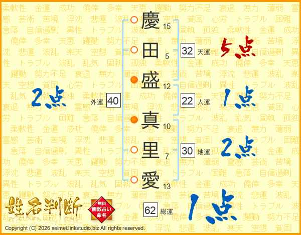 慶(15画)田(5画)盛(12画) 真(10画)里(7画)愛(13画)