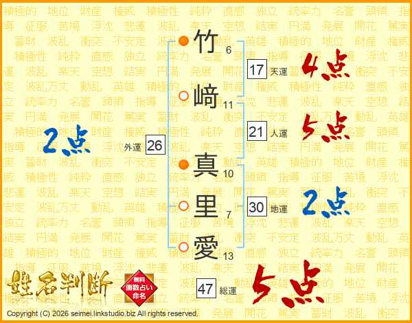 竹(6画)﨑(11画) 真(10画)里(7画)愛(13画)
