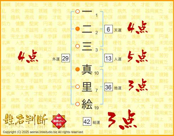 生活面を象徴する運勢です。外部から受ける影響力を表し、結婚運、家庭運や職場、環境への順応性を表します。総運から人運を引いた画数。姓や名が1文字の場合を除く。