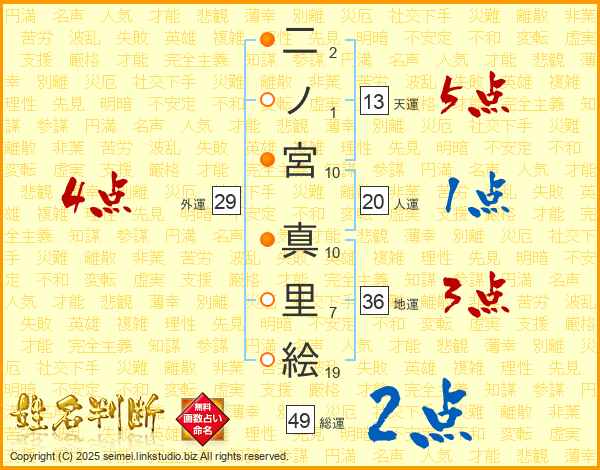 二(2画)ノ(1画)宮(10画) 真(10画)里(7画)絵(19画)