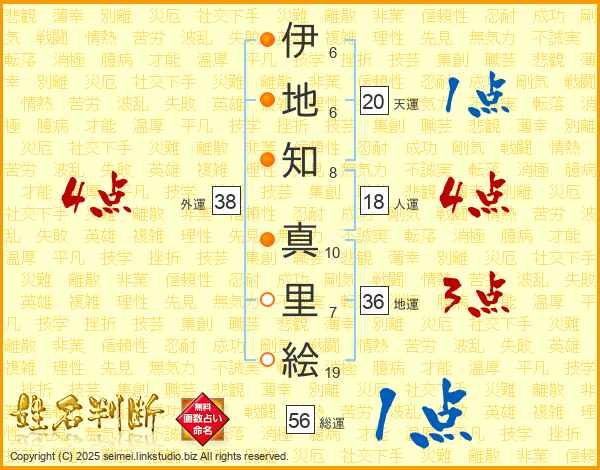 伊(6画)地(6画)知(8画) 真(10画)里(7画)絵(19画)