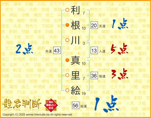 利(7画)根(10画)川(3画) 真(10画)里(7画)絵(19画)