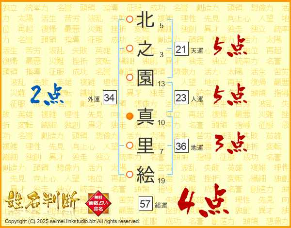 北(5画)之(3画)園(13画) 真(10画)里(7画)絵(19画)
