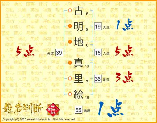 古(5画)明(8画)地(6画) 真(10画)里(7画)絵(19画)